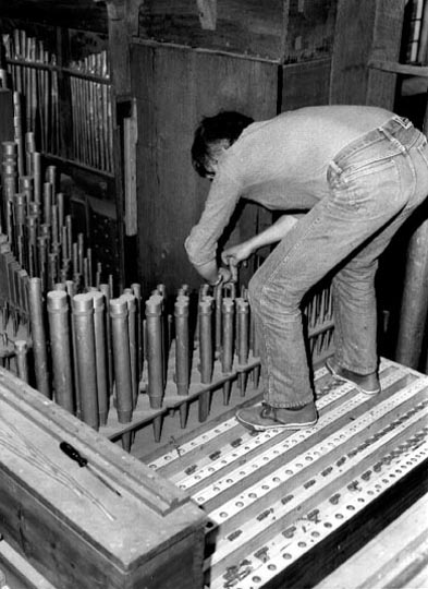 Orgelbaumeister Paschen beim Abbau der alten Orgel