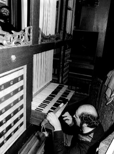 Orgelbaumeister Babel beim Regulieren der Traktur
