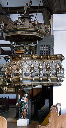 stattliche Kanzel, datiert 1684, ist an der Ecke zwischen Kirchenschiff und dem