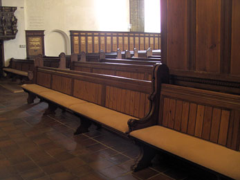 Bild rechts die neuen Sitzpolster der Kirchenbänke, geliefert vom Theodor-Schäfer-Werk