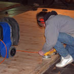 Abschleifen und Behandlung der Holzböden, Wiedereinbau der Sitzbänke. Dann die
